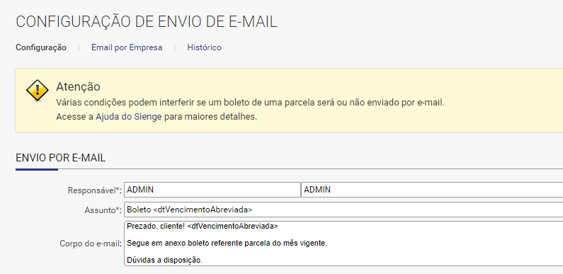 O corpo de email enviado será o mesmo cadastrado na Configuração do envio de email.