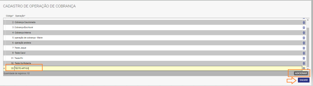 2. Para cadastrar uma nova operação de cobrança clique no botão Adicionar, informe o código, o nome para operação e clique no botão Salvar para confirmar o cadastro da operação de cobrança.