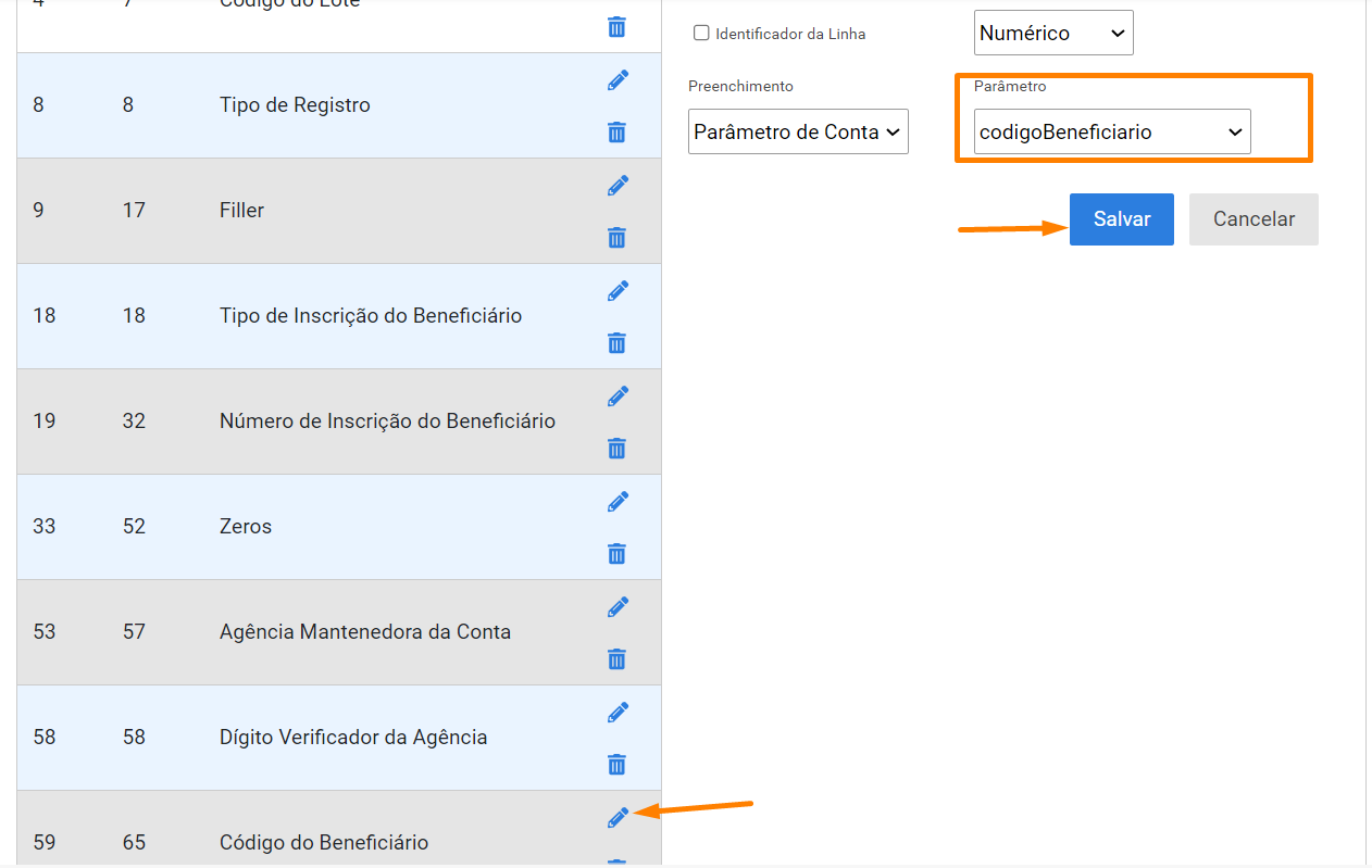 1.1- Posições: 59/65 Código do Beneficiário (setar o parâmetro da conta codigoBeneficiario)