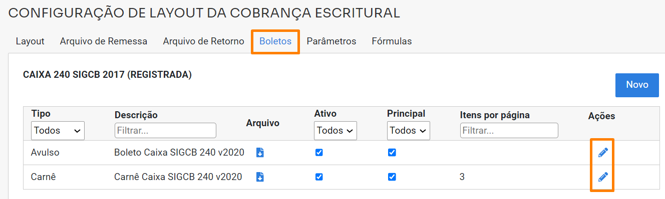 É possível incluir os modelos atualizados, para o sistema, acessando a aba "Boletos",