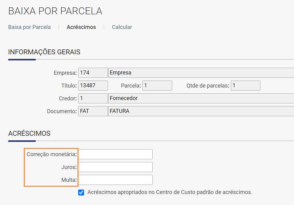 - Dentro da edição da parcela, navegue até a aba "Acréscimos";