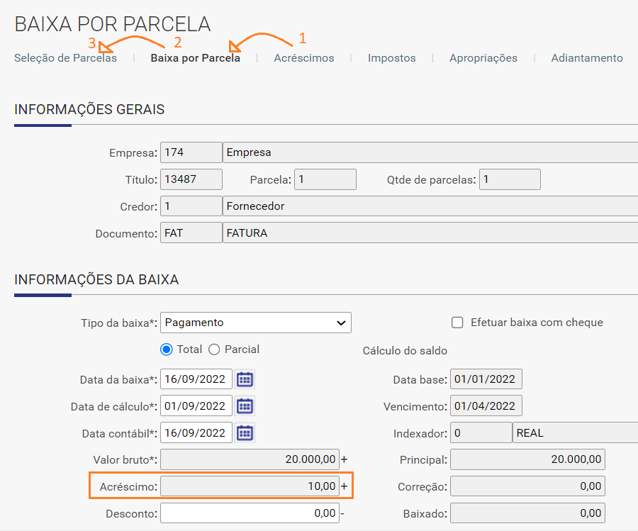 - Após inserir e salvar os acréscimos, retorne à aba "Baixa por Parcela". Em seguida, vá para a aba "Seleção de Parcelas";