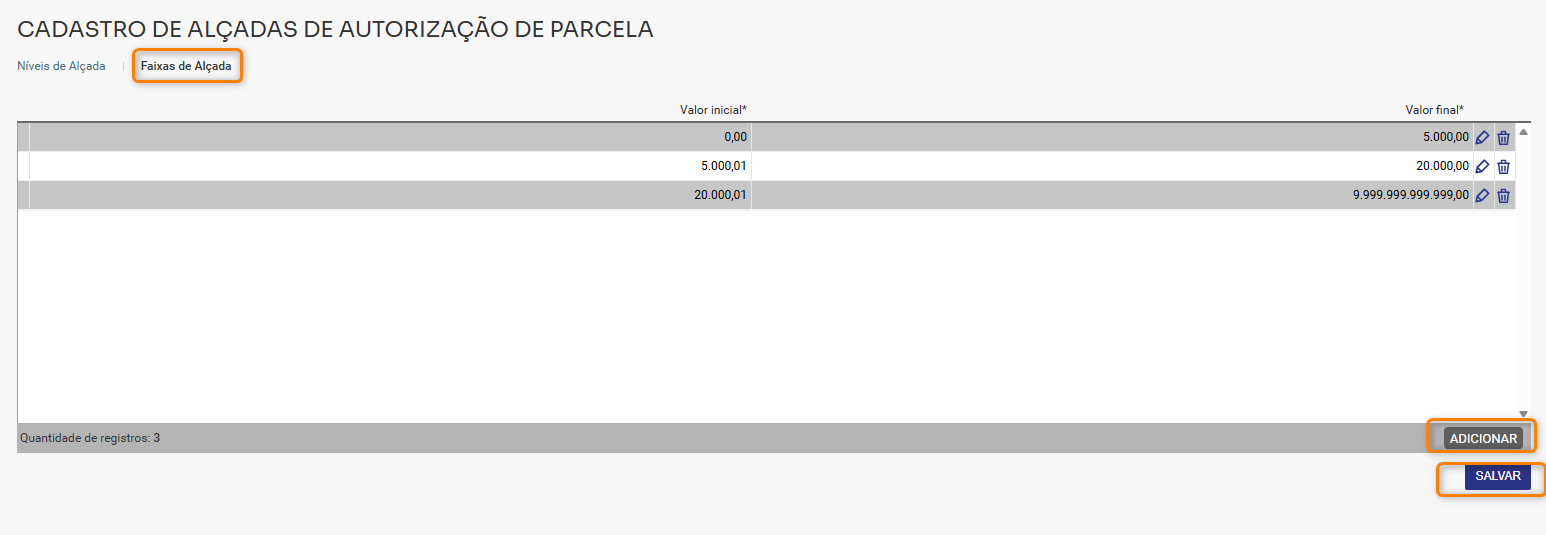 3- Na sequência, acessar aba Faixas de Alçada para cadastrar as faixas de valores para as alçadas que os Níveis, já cadastrados, deverão autorizar;