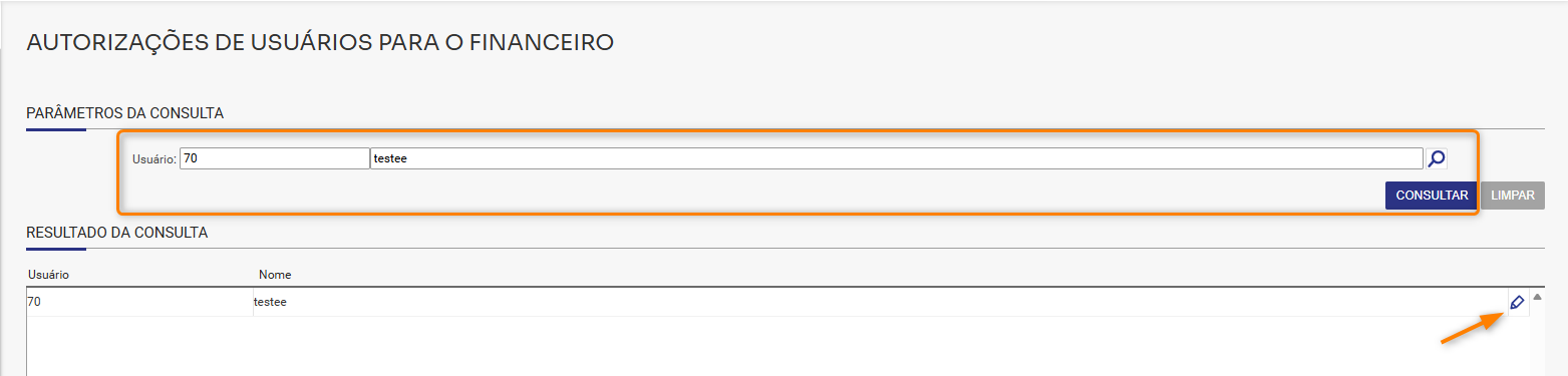 5- Por fim, será necessário determinar os usuários de cada nível de alçada criado. Essa permissão deverá ser feita em Segurança / Autorizações / Usuários / Financeiro, consultar pelo usuário e editar o registro no lápis de edição;