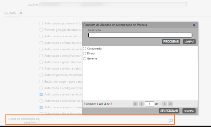 6-No campo "Alçada de autorização de pagamento", clique na lupa e selecione qual alçada este usuário pertencerá.