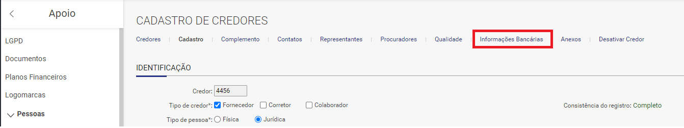 2. Dentro da tela de cadastro, ir na aba "Informações Bancárias";