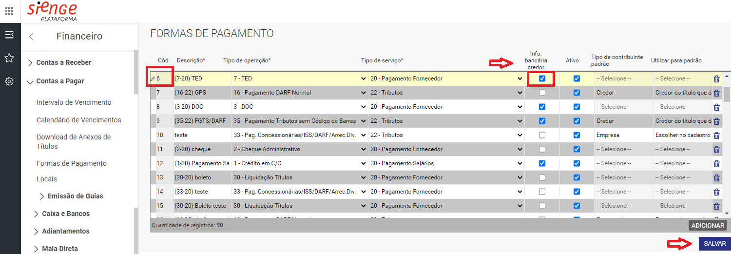 Na Forma de Pagamento escolhida para esse credor, marcar a opção "Info. Bancária Credor" e salvar a tela para confirmar.