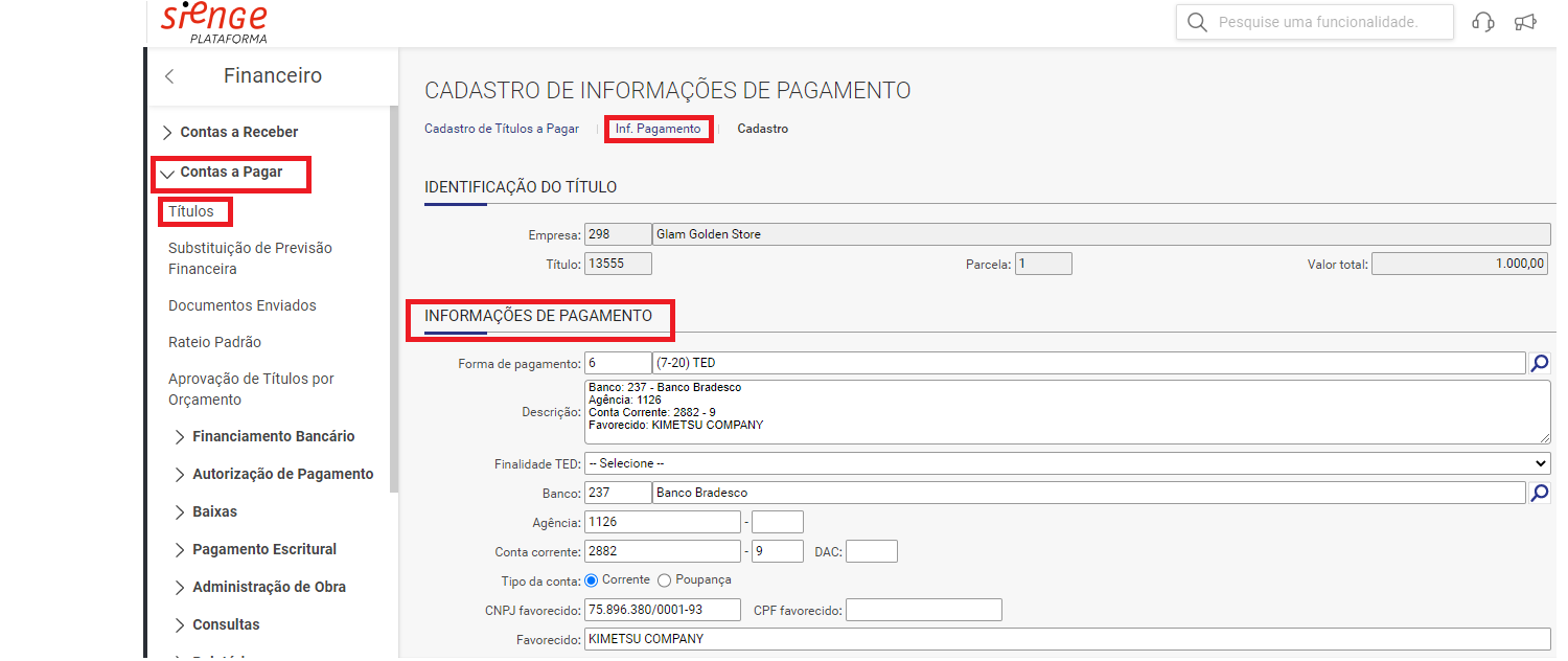 Agora sempre que cadastrar um título a pagar para este credor, na aba Informações de pagamento do título, o sistema irá preencher automaticamente as informações conforme cadastro do credor feito previamente.