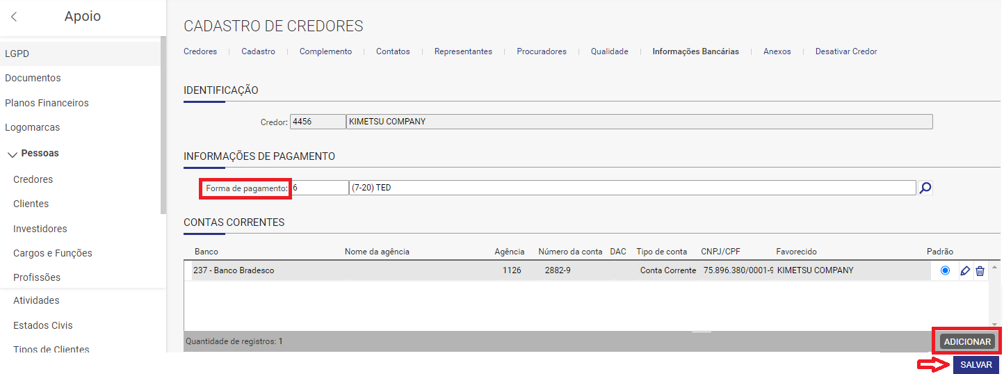 3. Na tela de informações bancárias, você irá cadastrar os dados bancários do credor, definir a forma de pagamento padrão e Salvar;