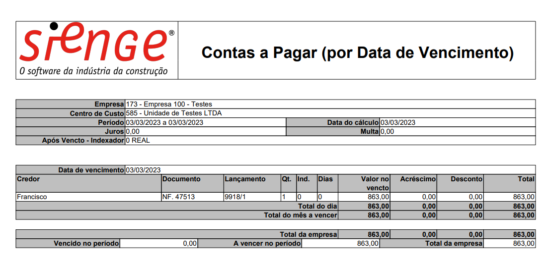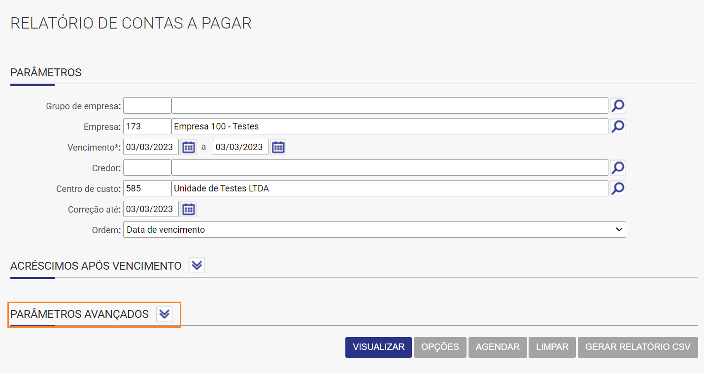 - Acessar: Financeiro / Contas a Pagar / Relatórios / Contas a Pagar e inserir os filtros desejados. Somente o período é obrigatório;