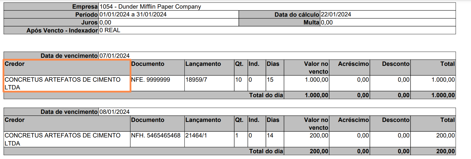 Atenção! O campo Município não inclui no relatório a coluna com a informação do município associado ao credor.