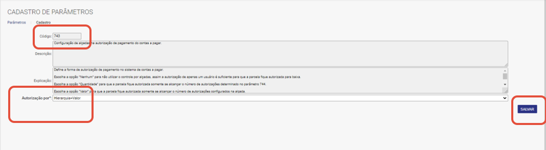 Parâmetro 743 – Configuração de alçadas na autorização de pagamento do contas a pagar, utilizar a opção de Hierarquia+Valor, conforme imagem abaixo.