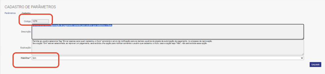 Parâmetro 1270 - Permitir aviso sobre reprovação de pagamento somente para usuário que cadastrou o título estar como “Sim”, conforme imagem abaixo