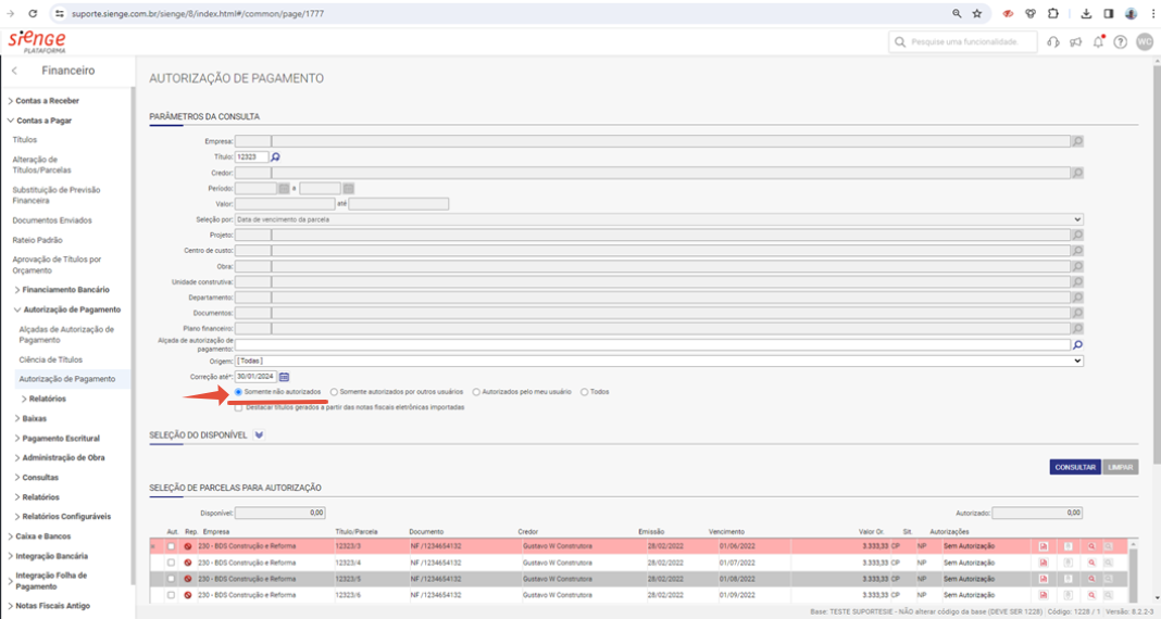 Realizamos a implementação de uma nova funcionalidade na parte de autorização de parcelas para pagamento, onde ao realizar a reprovação da parcela, poderá enviar a notificação apenas para o usuário que cadastrou o título.