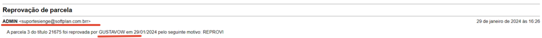 Com a nova implementação, quando realizar a reprovação de uma parcela para pagamento não será notificado todos os usuários responsáveis para aprovação na alçada, somente será notificado o usuário que cadastrou o título.