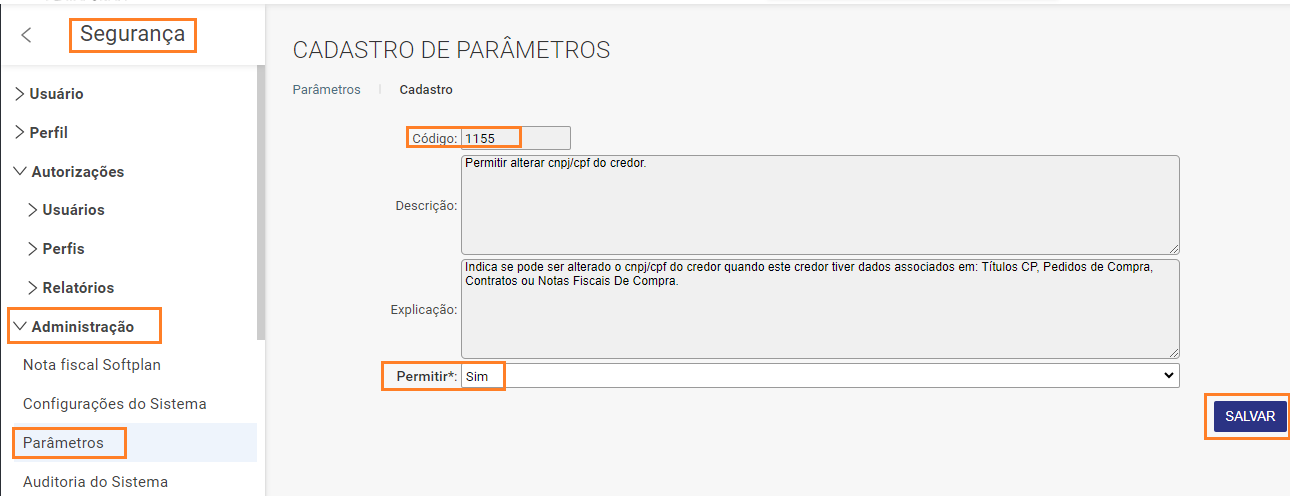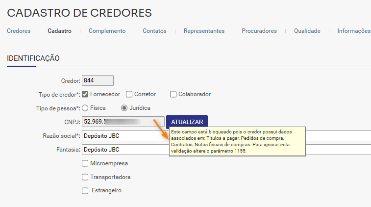 - Acesse: Segurança / Administração / Parâmetro, filtre pelo parâmetro 1155- Indica se pode ser alterado o cnpj/cpf do credor quando este credor tiver dados associados em: Títulos CP, Pedidos de Compra, Contratos ou Notas Fiscais De Compra, configure para "Sim" e salve no final da tela: