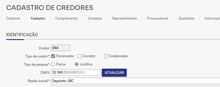 É possível que ao acessar o cadastro do credor o campo de CPF e CNPJ esteja bloqueado para alteração, como neste exemplo abaixo: