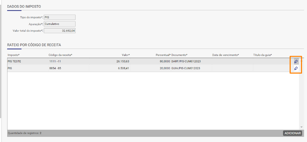 Passo 3 - Edite o rateio por código da receita referente a guia que deseja excluir (imagem do lápis)