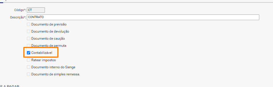 Passo 3 - No cadastro do documento verifique se está habilitado a flag "Contabilizável" conforme imagem a seguir: