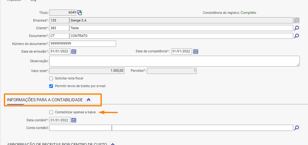 Passo 5 - Dentro do cadastro do título deve visualizar se a flag "Contabilizar apenas a baixa" está marcada e se o título está com a data contábil no período em questão.