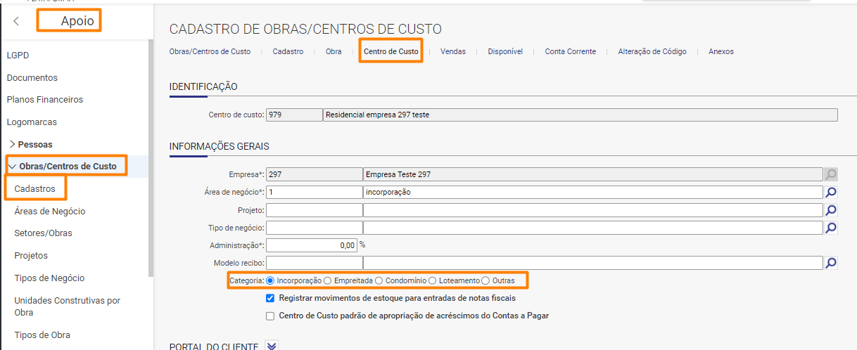 Passo 6 - Além da configuração do documento e parâmetro, deve-se observar também a configuração do centro de custo utilizado no título, localizado em: Apoio > Obras/Centros de Custo > Cadastros > Aba "Centro de custo" > Categoria definida para o centro de custo em questão. Conforme imagem a seguir: