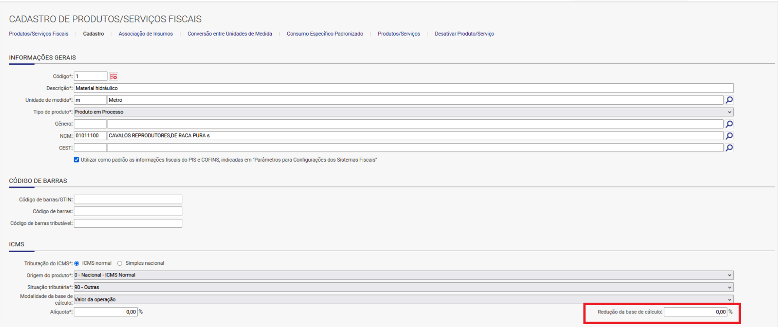 Atenção! O cálculo do ICMS dos produtos levará sempre como base o valor total do item para composição de sua base e caso o item tenha redução na base de cálculo, vamos considerar o percentual informado em ‘Cadastro de produto/serviço’ no campo ‘Redução da base de cálculo’, conforme imagem abaixo: