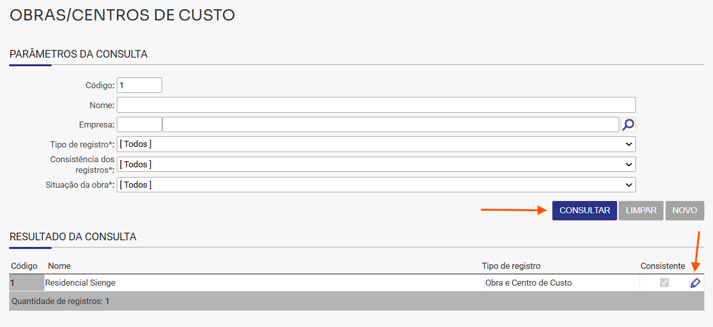 1. Para realizar a configuração da apropriação de obra, acesse o caminho Apoio > Obras / Centros de Custo > Cadastros e localize a obra desejada. Informe os parâmetros de consulta obrigatórios (*) e clique em Consultar. Ao localizar a obra desejada no resultado da pesquisa, clique no lápis de edição do registro para abrir o registro dessa obra: