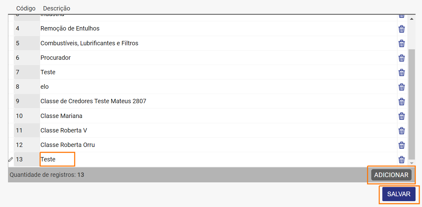 - Selecionar o botão de "Adicionar", preencher o nome da classe e selecionar "Salvar";