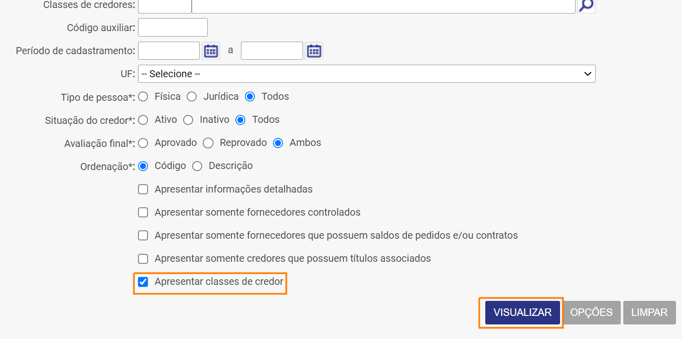 - Marcar a Flag "Apresentar classes de credor" e clicar em "Visualizar";