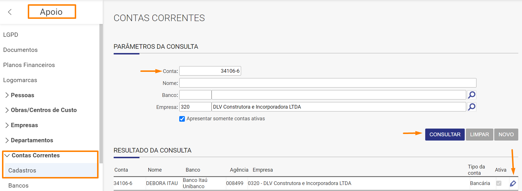 1- Na tela nova deve acessar Apoio / Contas correntes / Cadastros, consulte a conta corrente que deva ser configurada, clique no lápis de edição e acesse na página de cobrança escritural.