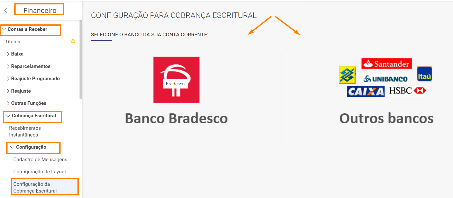 1.1 - A outra tela onde é possível configurar a cobrança escritural se encontra dentro do módulo financeiro, poderá acessar Financeiro / Contas a Receber / Cobrança Escritural / Configuração / Configuração da Cobrança Escritural, na tela deve selecionar a aba pertinente ao seu banco, se for o banco Bradesco clicar no lado esquerdo, e no lado direito os demais bancos.