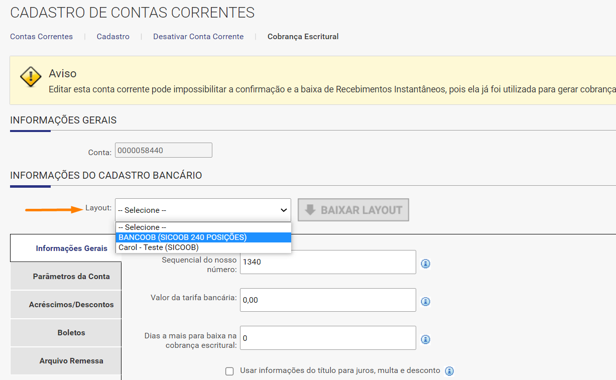 2- Acessando em ambas as páginas, a primeira orientação é selecionar o layout de cobrança, o layout é definido pelo banco, então deve marcar a opção conforme orientado pelo banco.