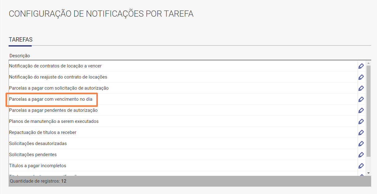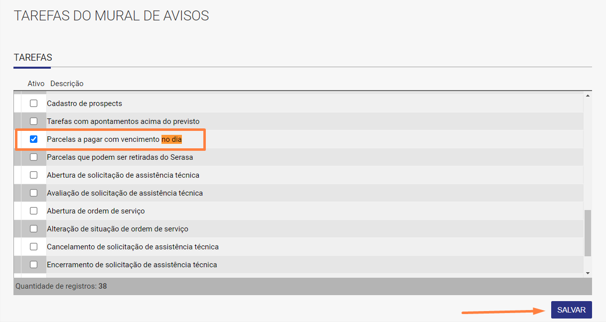 1. Acesse: Segurança / Administração / Mural de Avisos / Tarefas e marque a flag "Ativo" para a tarefa "Parcelas a pagar com vencimento no dia" e depois clicar em "Salvar".
