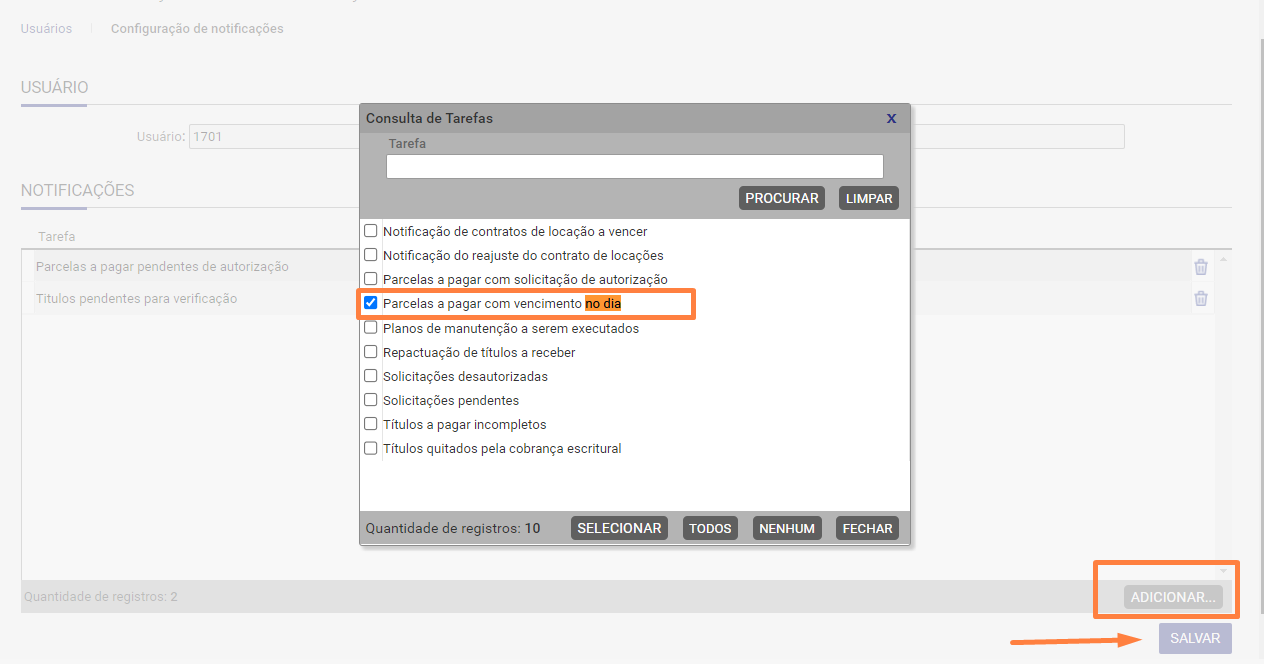 2. Consulte pelo nome ou código do usuário e abra a tela de edição. Adicione a tarefa "Parcelas a pagar com vencimento no dia" e salve a tela.