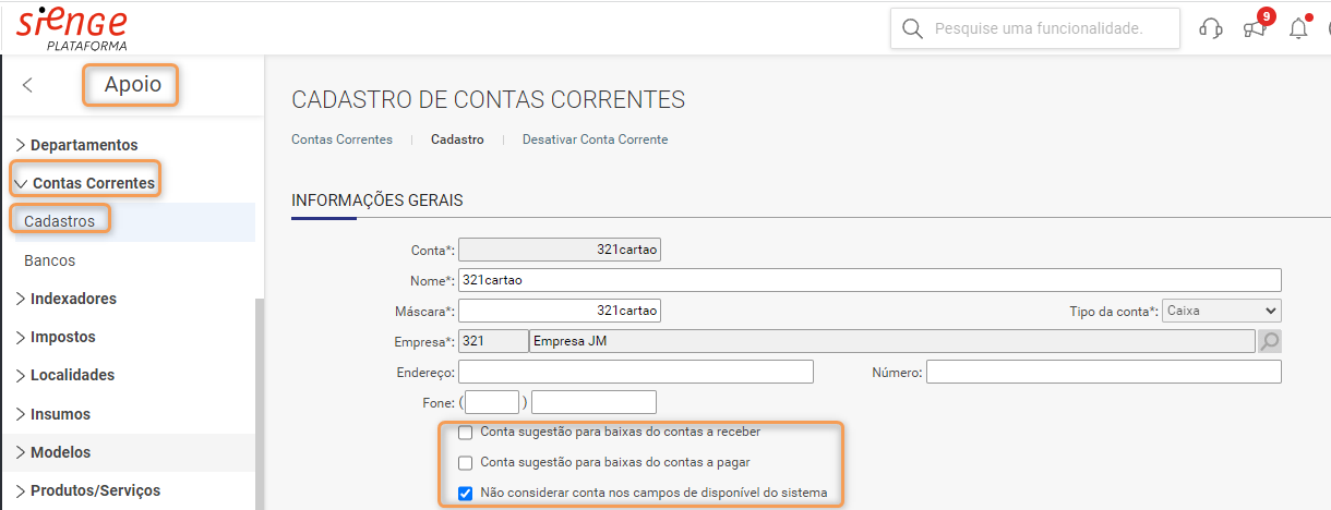 Algumas contas correntes são cadastradas no Sienge com o objetivo de registrar operações internas, como por exemplo, conta do tipo caixa do colaborador, conta para controle de cartão de crédito, entre outras. Este artigo ensina como configurar este tipo de conta para que não seja considerada nos relatórios.