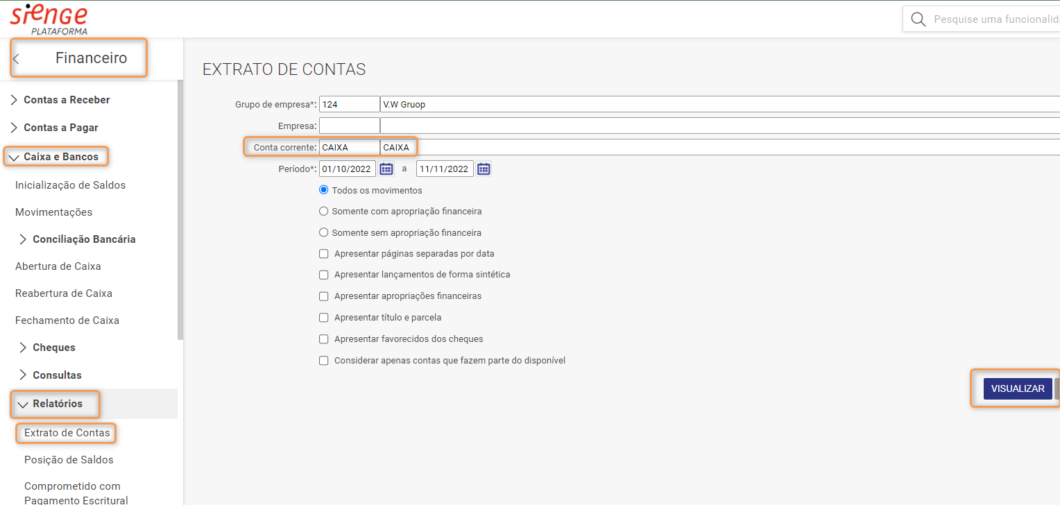 - Acesse: Financeiro > Caixa e Bancos > Relatórios > Extrato de Contas. Indique os filtros desejados e clique no botão "Visualizar", selecionando a conta caixa.