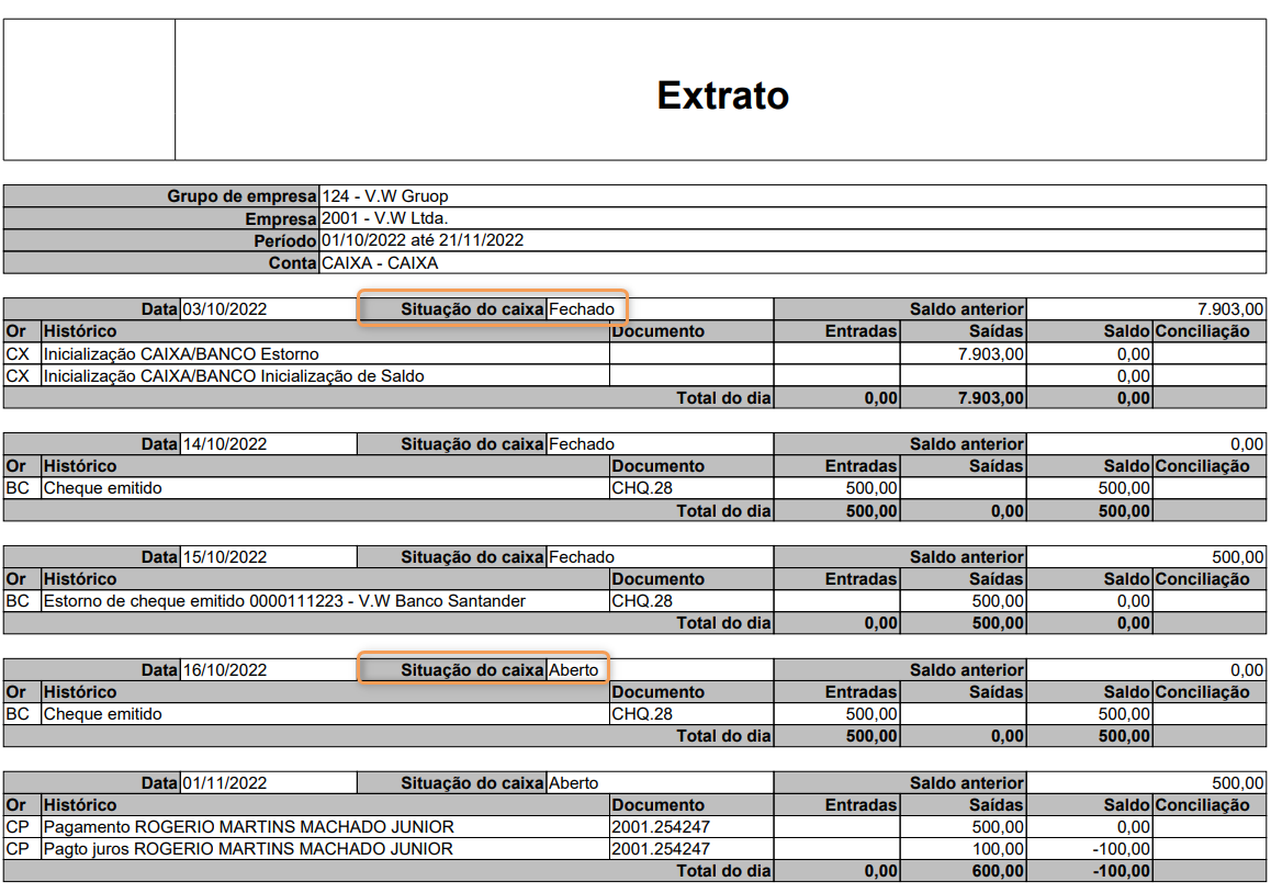 Dessa maneira, será possível identificar qual a situação do caixa na data desejada, se está aberto ou fechado.