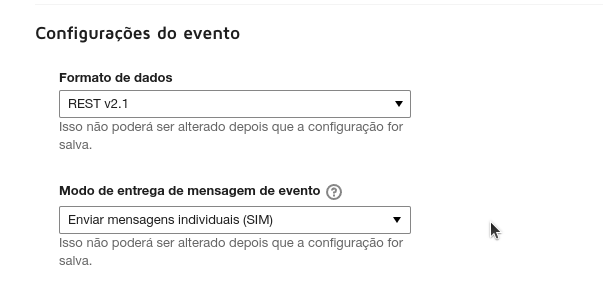 Passo 4) Em Configurações do evento utilizar a opção REST v2.1 e Enviar mensagens individuais (SIM).