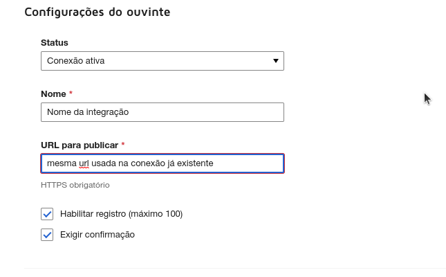 Passo 2) Utilizar a URL enviada pelo suporte e marcar os checkboxes - ajustar informação no print em 'URL para publicar';