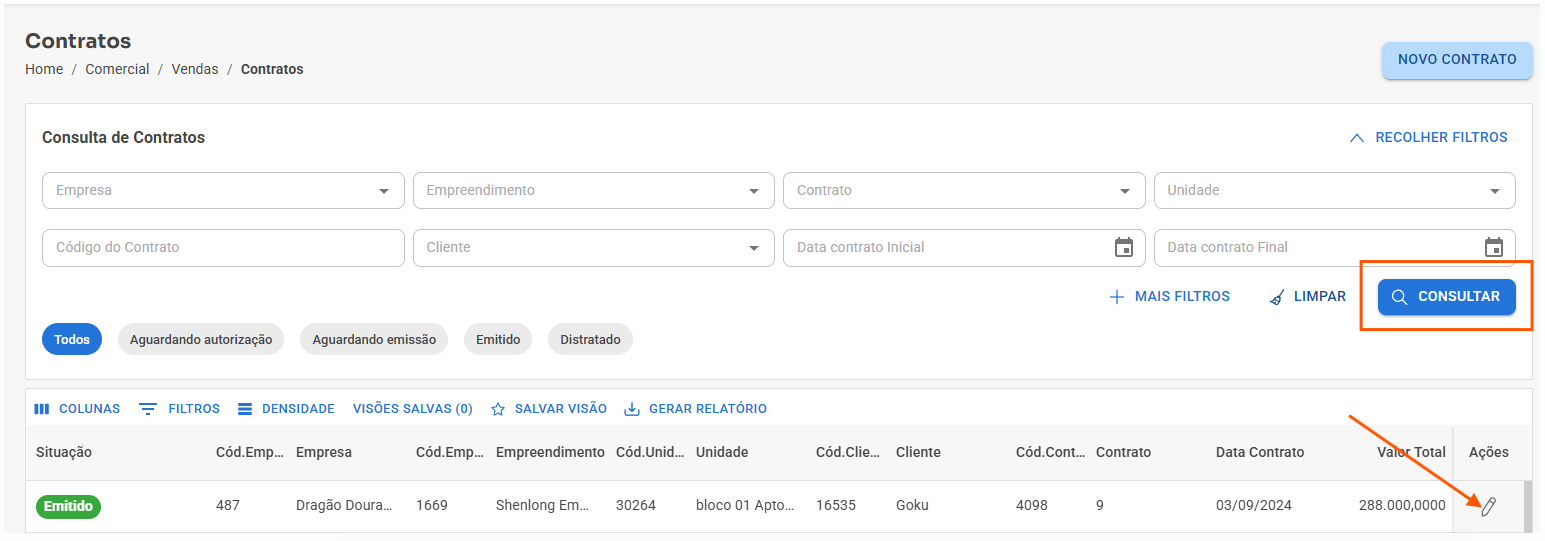 Para que seja possível realizar a alteração do número do contrato de venda, é necessário que o parâmetro 500 esteja liberado e que o usuário tenha liberação para editar contratos emitidos.