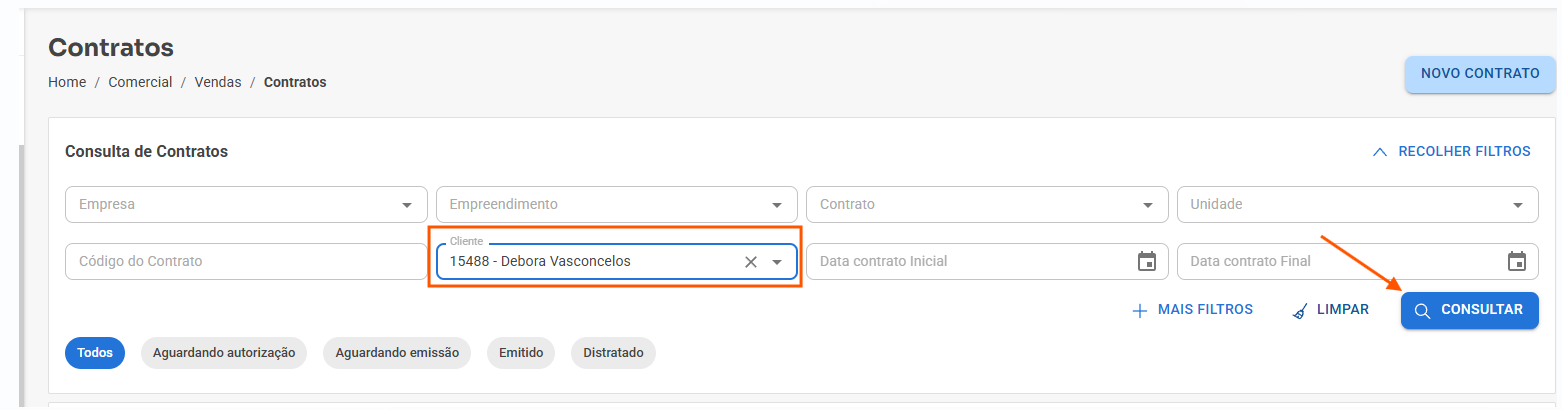 1- Acesse Comercial > Vendas > Contratos > Contratos, informe os parâmetros de consulta e clique no botão Consultar.