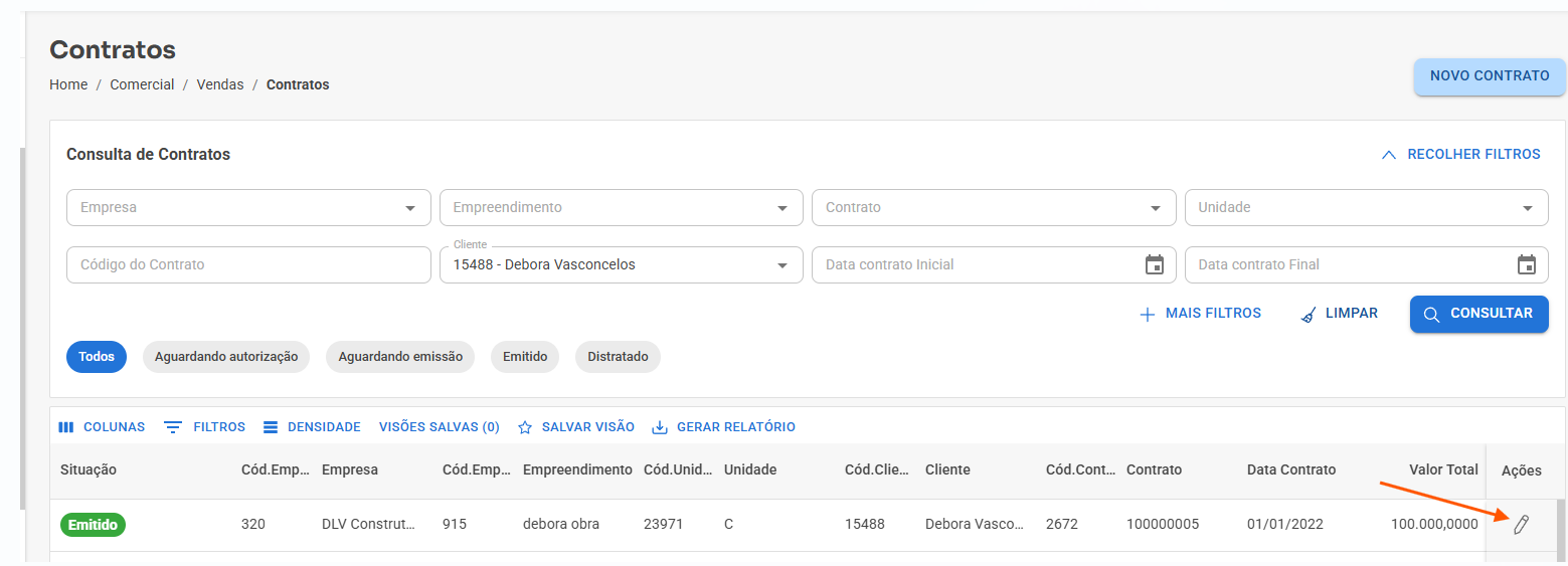 2- Quando o sistema apresentar o contrato, deve-se clicar no lápis de edição.