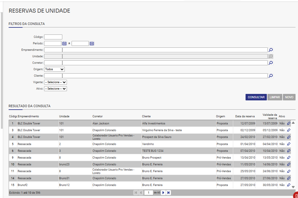 2. Consultar a unidade em questão, podendo filtrar por empreendimento, período, etc.