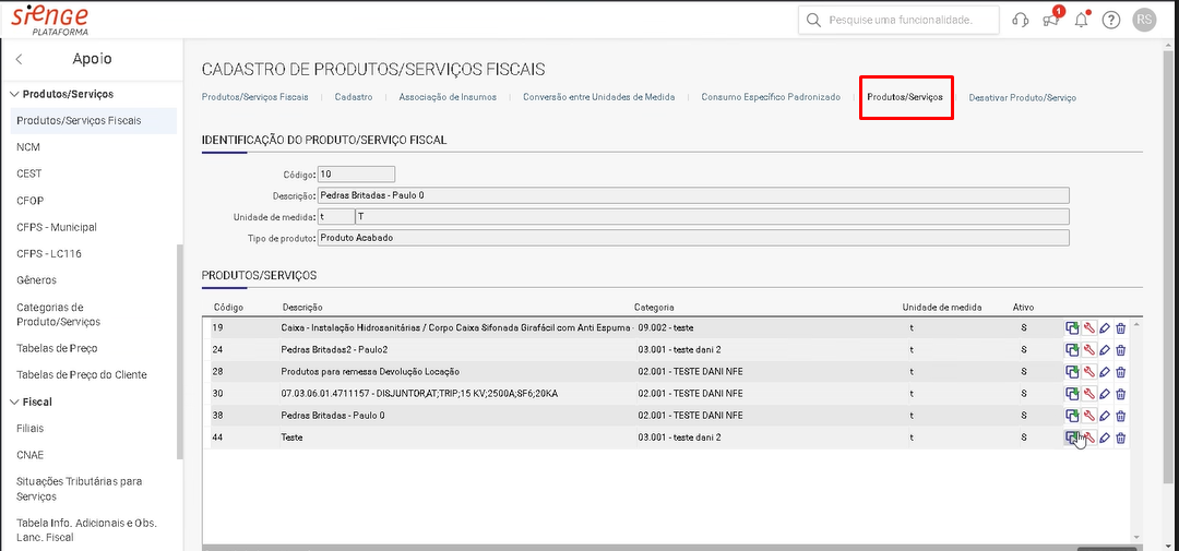 O cadastro de produto/serviços fica agora localizado em uma aba dentro do produto/serviço fiscal, centralizando assim os itens por produto/serviço fiscal.