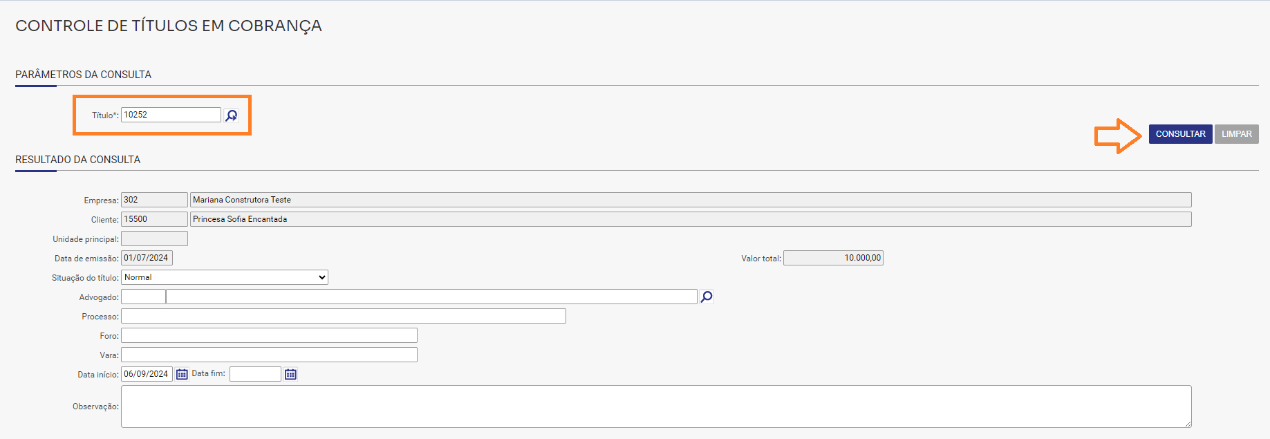 Para realizar o controle do título em cobrança, informe-o e clique no botão Consultar