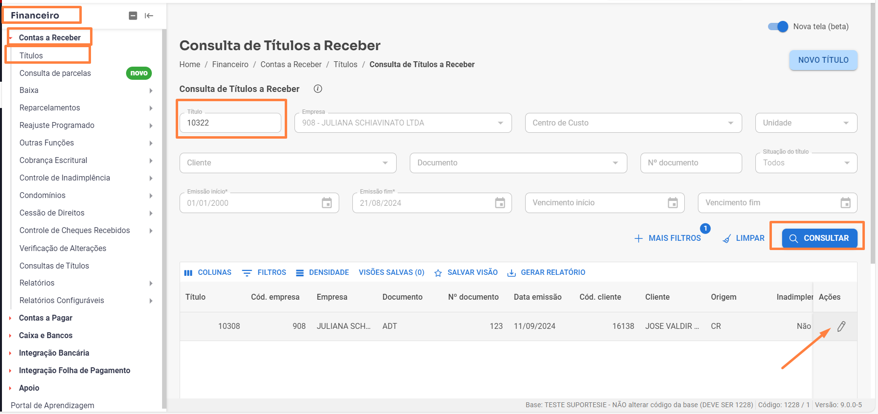 1- Para alterar o indexador de um título com correção monetária, acesse a rotina Financeiro / Contas a Receber / Títulos, localize o título que necessita alteração e clique no ícone do lápis para editar o registro.