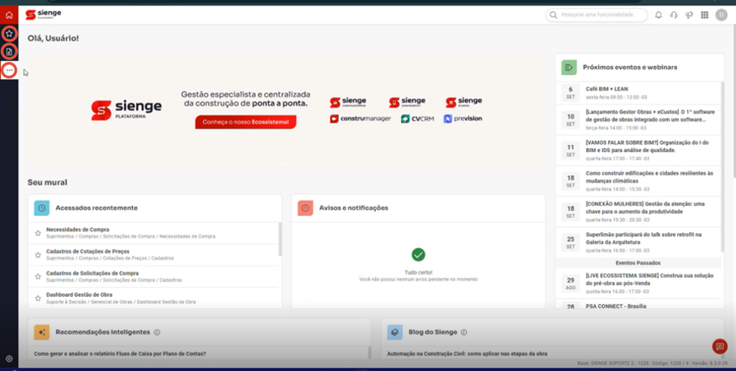Acessando o Sienge Plataforma com seu login e senha, na página inicial observe uma nova barra a esquerda. Essa barra esquerda é a nova barra de menu.