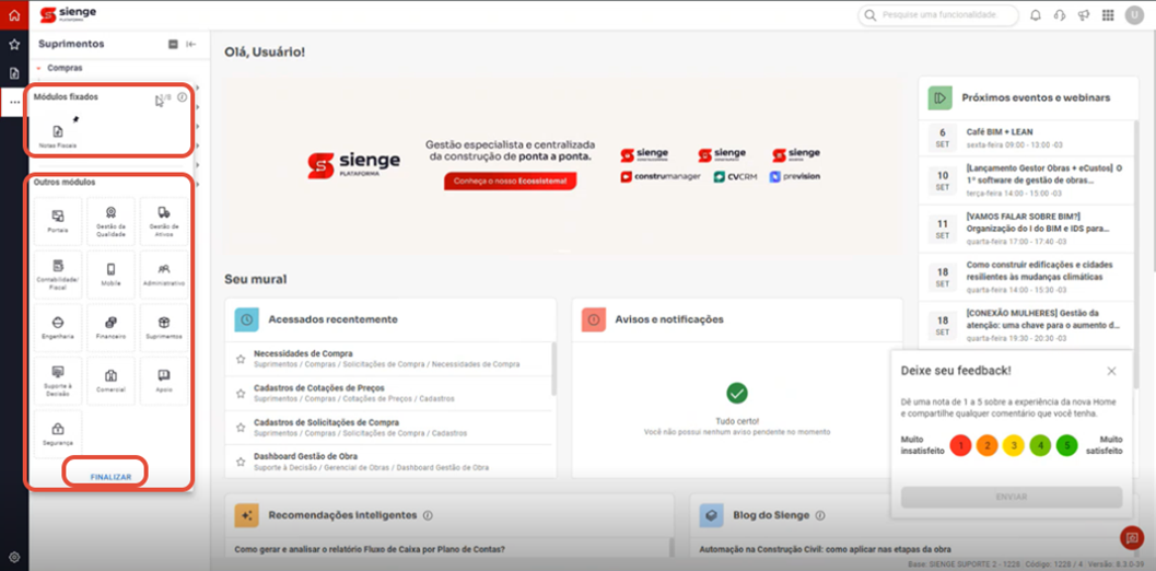 Você já deve ter notado que o Sienge Plataforma esta de cara nova. As principais mudanças estão na página inicial do sistema (home), como podemos observar na imagem abaixo o “antes e depois”.