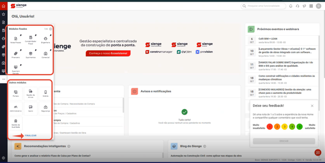 Nota! A nova atualização do Sienge Plataforma é focada em tecnologias que permitem padrões mais modernos de usabilidade e que conectam, com ainda mais praticidade, nossa plataforma às demais soluções do Ecossistema Sienge. Organizamos informações de forma mais direta e acessível para uma solução ainda mais intuitiva e fácil de utilizar, mas se ainda assim você sentir dificuldade procure nosso Canal de Atendimento.