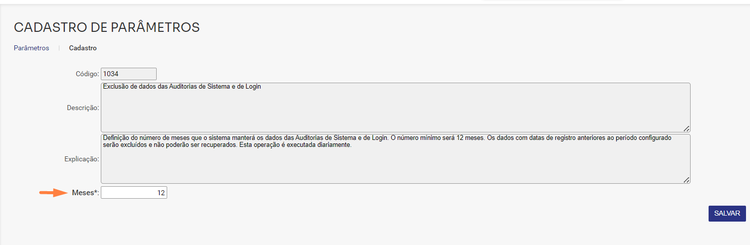 Atenção!. O número mínimo será 12 meses. Os dados com datas de registro anteriores ao período configurado serão excluídos e não poderão ser recuperados